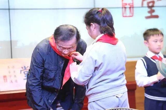 讲座以一段《修齐讲堂铭》诵读开始,华漕学校的学生为任哥舒老师佩戴红领巾、敬队礼、献上鲜花,表示对任老师的欢迎和尊敬。