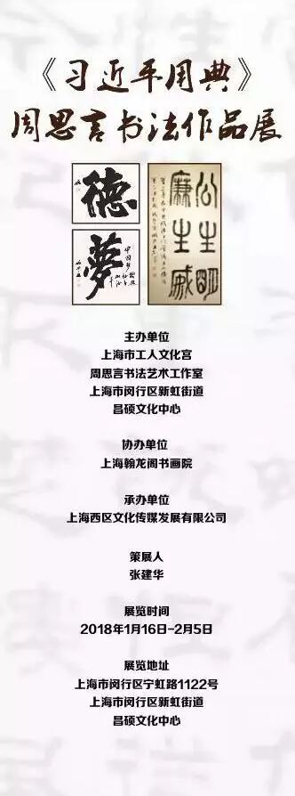 展览名称:《习近平用典》周思言书法作品展展览日期:2018年1月16日——2018年2月5日开放时间:每日9:00——16:00(逢周一闭馆)